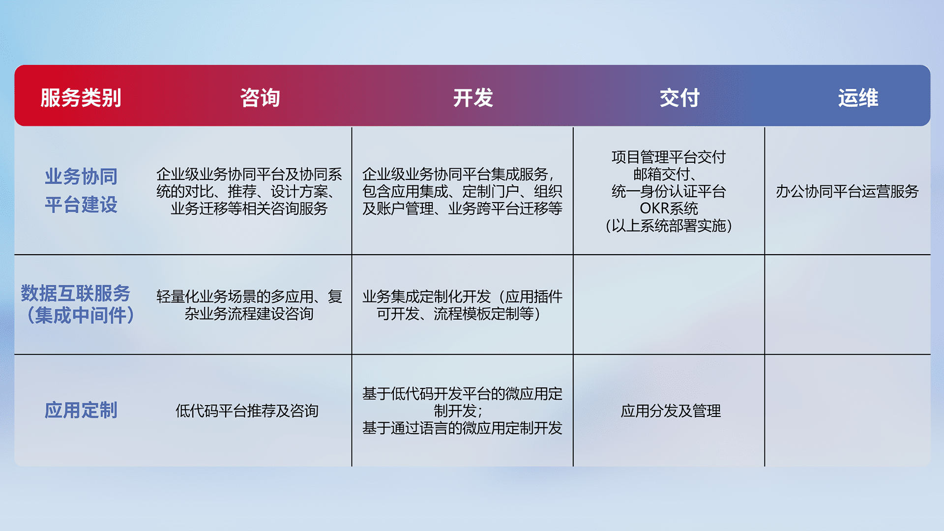 针对钉钉、、、企微、、、、IDaas等平台级产品提供产品的规划、、、方案、、、、交付、、、定制化开发等服务,,实现如统一协同办公、、、智能客户服务、、、、混合会议管理、、、、智能数据查询、、、、等业务场景,,实现数字化转型。。。。